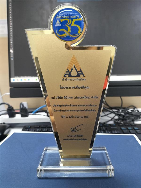 โล่ประกาศเกียรติคุณ เพื่อเชิดชูเกียรติว่าเป็นสถานประกอบการต้นแบบ ในการชำระเงินสมทบกองทุนประกันสังคมดีเด่น