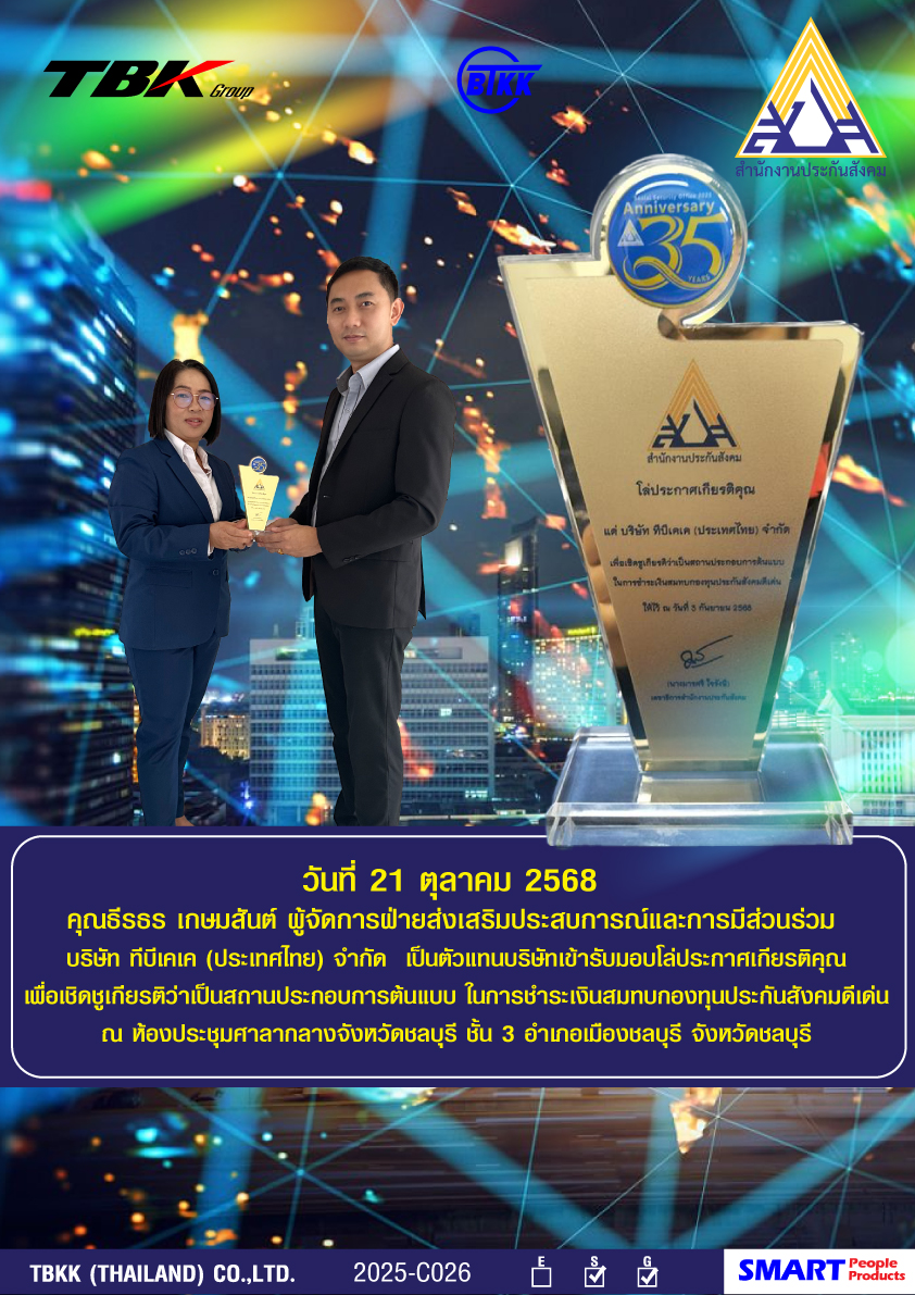 บริษัท ทีบีเคเค (ประเทศไทย) จำกัด  เป็นตัวแทนบริษัทเข้ารับมอบโล่ประกาศเกียรติคุณ