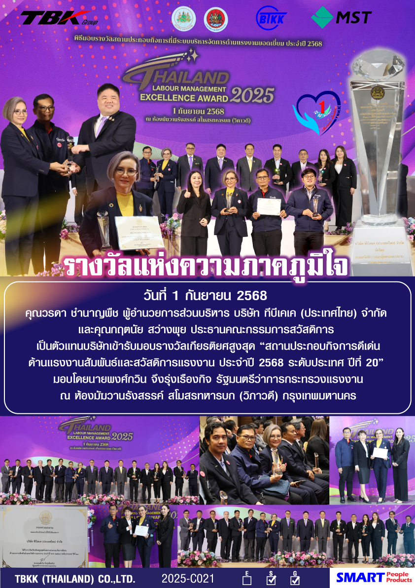 วันที่ 22 กันยายน 2568 คุณวรดา ชำนาญพืช ผู้อำนวยการส่วนบริหาร บริษัท ทีบีเคเค (ประเทศไทย) จำกัด